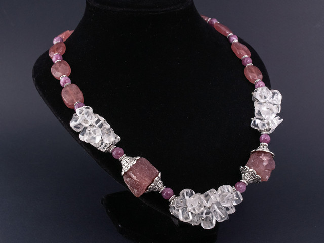 Матеріали: кварц, полуничний кварц (Мадагаскарський), натуральний гірський кришталь, фурнітура кольору срібла, замочок карабін.