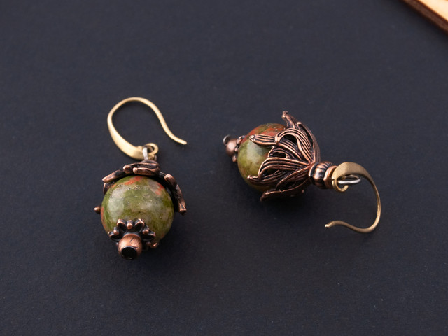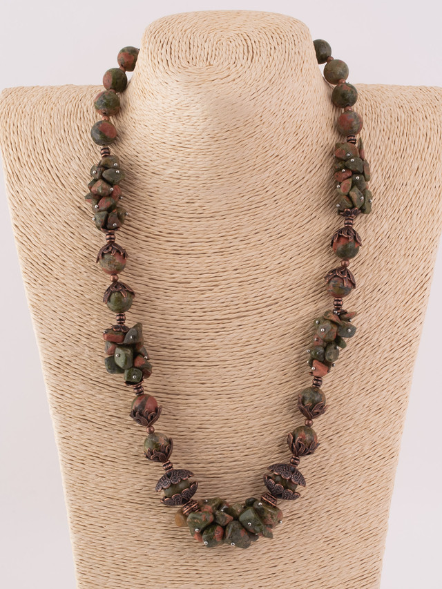 Матеріали: натуральний камінь яшма унакит (дрібні відколи, гладкі поліровані намистини), мідна вінтажна фурнітура.