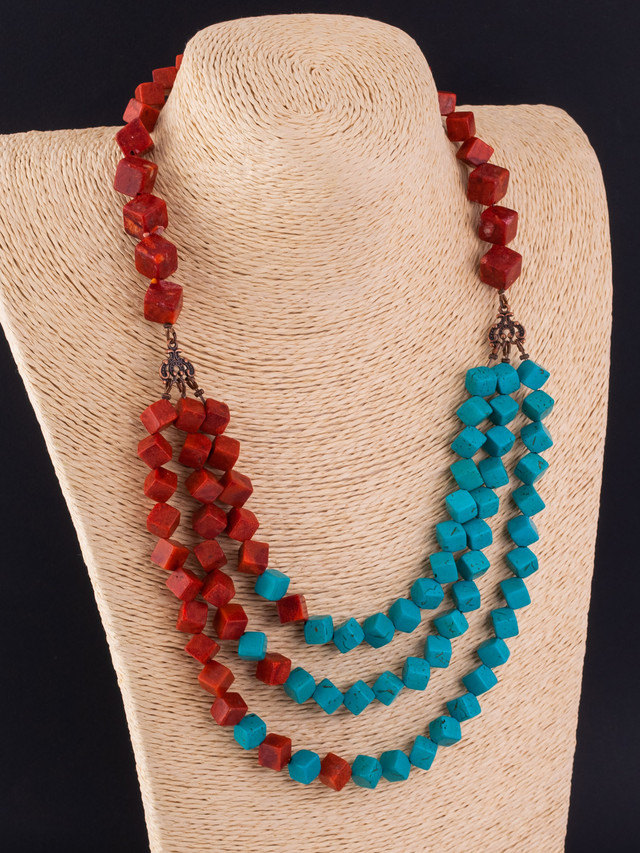 Намисто "Мальдіви"- авторська робота з натуральних каменів. Яскраве, ошатне, асиметричне намисто з губчастого корала і блакитної бірюзи в оригінальній формі кубиків. Прикраса легка і комфортна, зібрана в три нитки каскадом спускається в зону декольте, з м'яким переходом кольору.